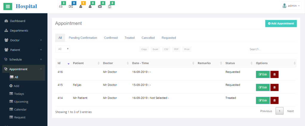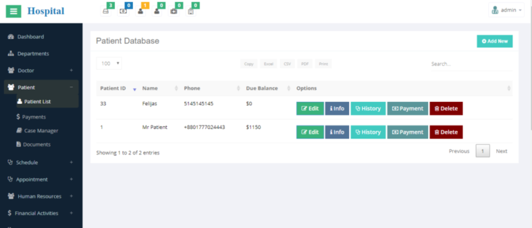 From Patient’s name table individual patient information can be edited, patient history can be seen and payment can be done.