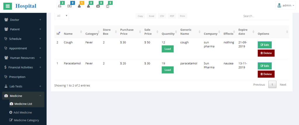 Click “Medicine List” at the side menu.It will display List of medicines.